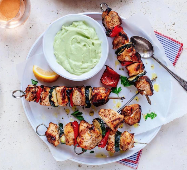 Preheat grill or grill pan to medium-high heat. Grill chicken until lightly charred and cooked through, about 10-12 minutes total. Serve with Cucumber salad, avocado cream, and fresh lemon wedges.